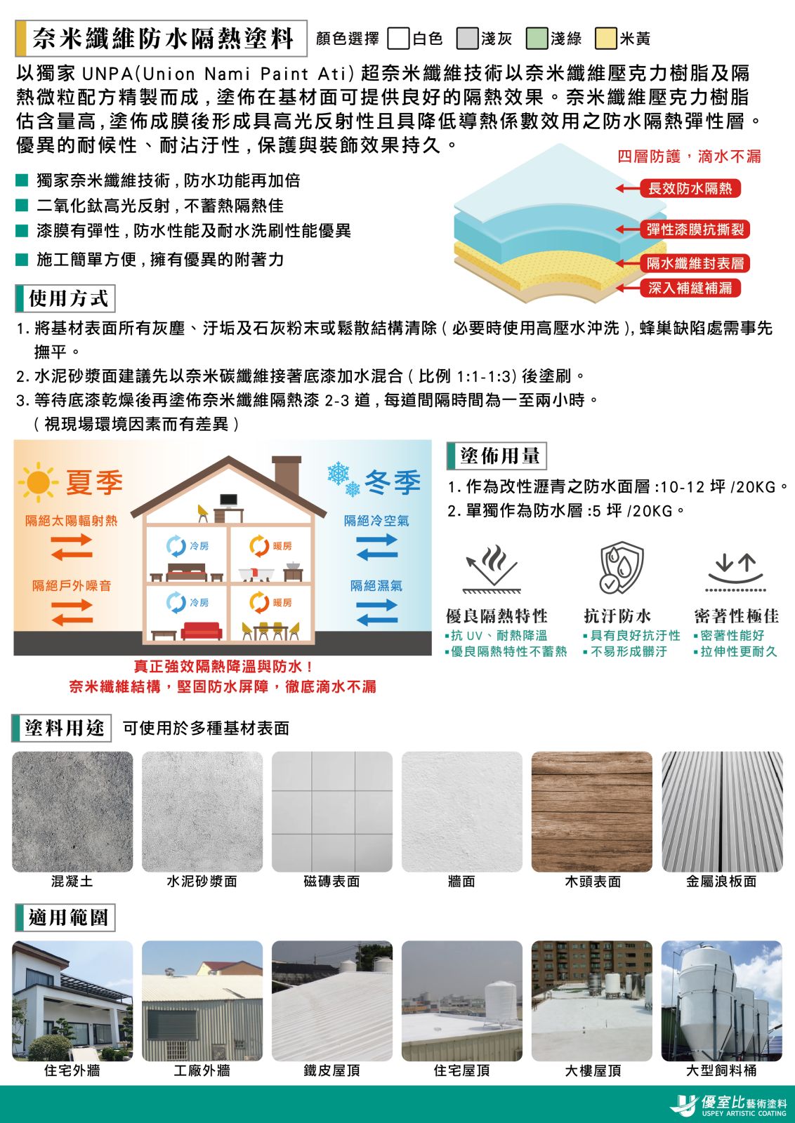 環保隔熱塗料為一種環保型高分子聚合物,除具有質地輕、隔熱性佳外,耐候性、附著性、耐水性優異,更具保溫、隔音、防水的功能。