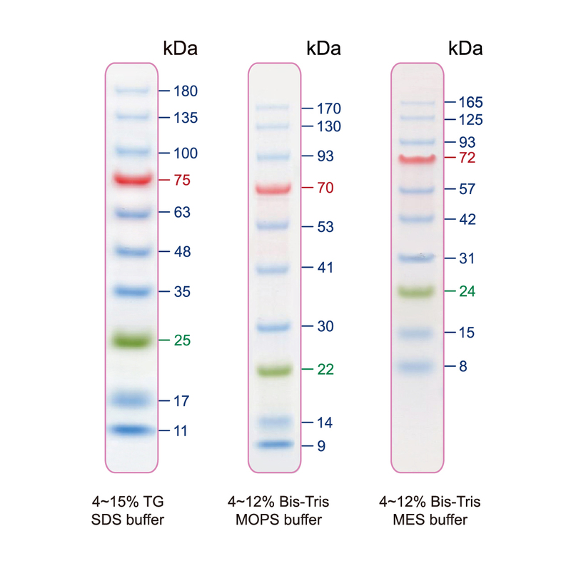 • The Blu10 Prestained Protein Ladder (BlueRAY) is a combination of 10 pre-stained proteins with molecular weights from 11 to 180 kDa. The 10 recombinant proteins are covalently coupled with blue chromophore, while 1 green band at 25 kDa and a red band at 75 kDa, serve as reference bands. The Blu10 Prestained Protein Ladder (BlueRAY) keeps track of the size and separation of proteins during SDS-polyacrylamide gel electrophoresis, approximating protein size, and validating Western transfer efficiency on PVDF, nylon, or nitrocellulose membranes.